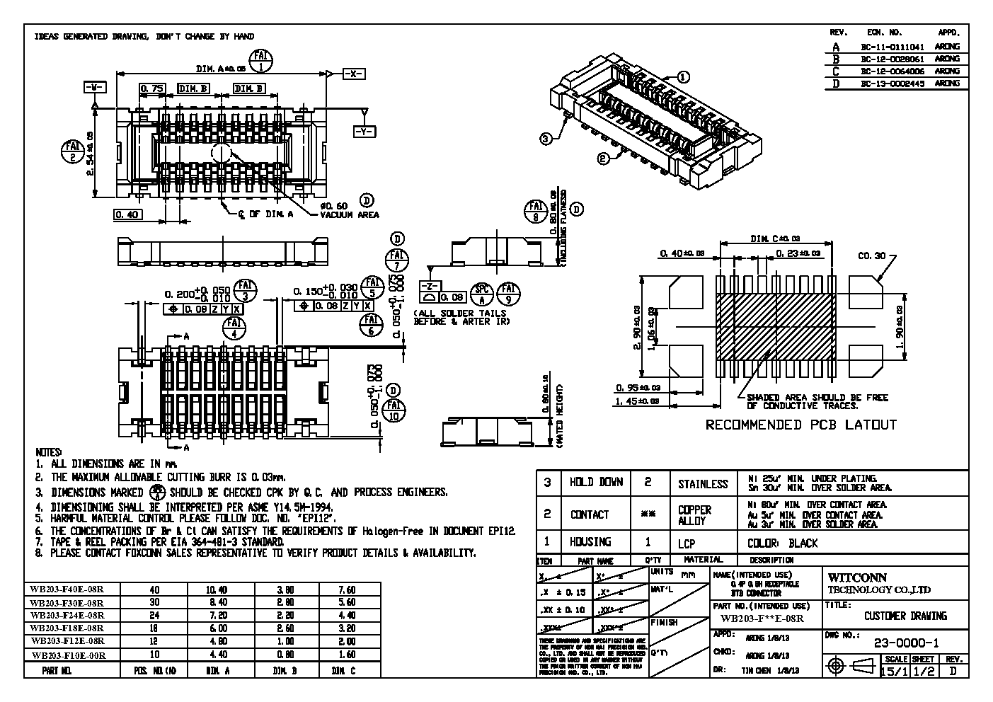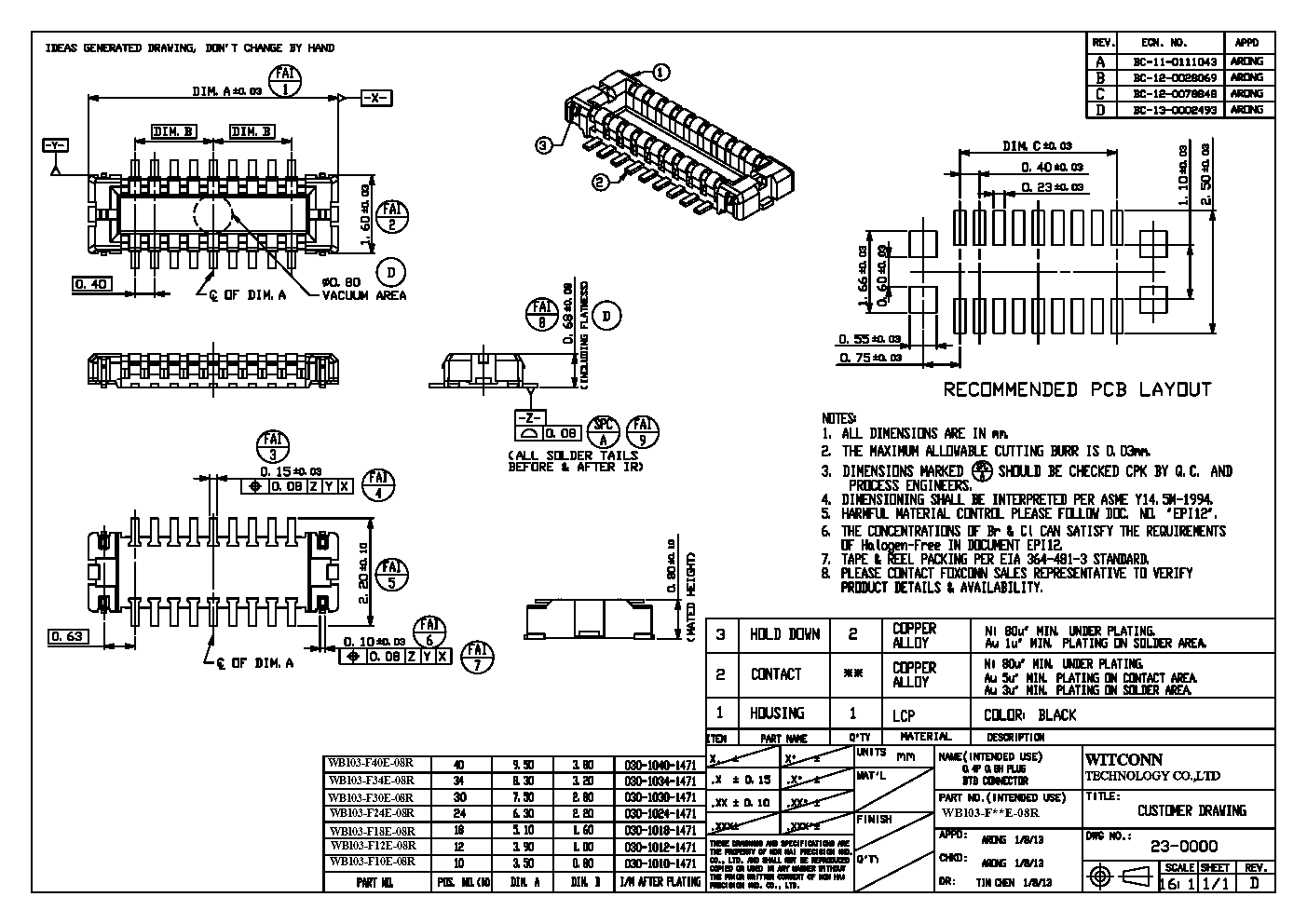 0.4PH 合高0.8 板对板连接器 支持软板到硬板连接 该规格板对板公座料号是WB103-FXXE-08R, 母座料号是WB203-FXXE-08R, 广泛应用于手机、穿戴等电子设备。 公座3D 母座座3D 图纸