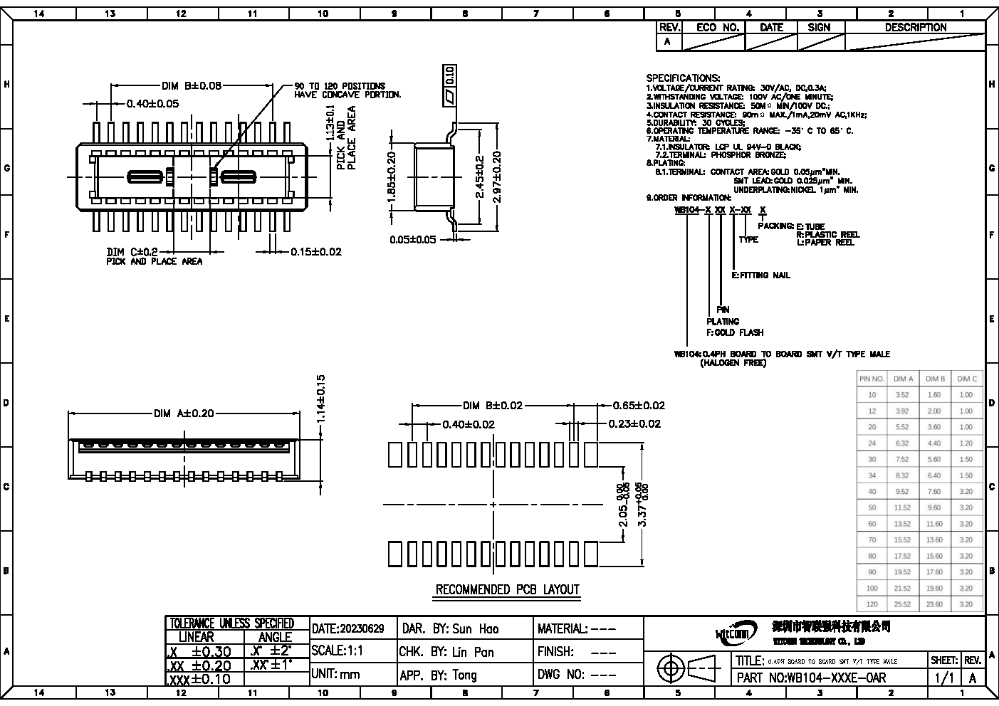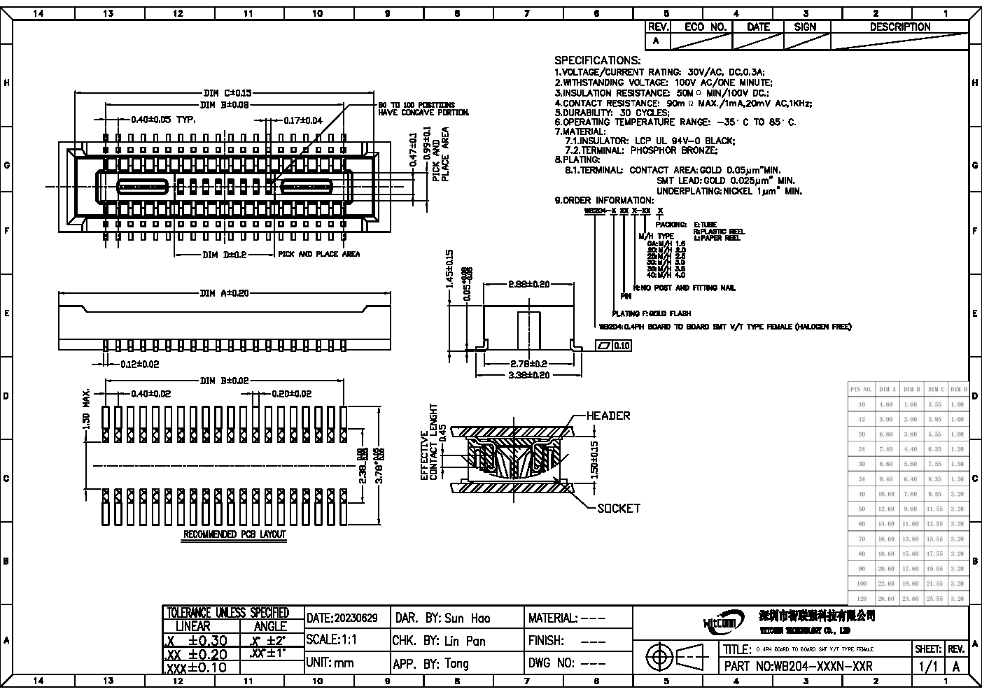 该规格板对板公座料号是WB104-FXXE-0AR, 母座料号是WB204-FXXE-0XR, 广泛应用于手机、穿戴等电子设备,兼容广濑DF40C系列。