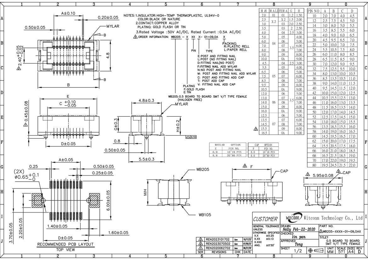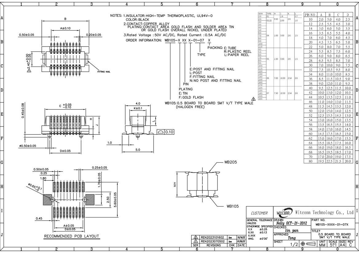 该规格板对板公座料号是WB105-XXXX-XXL, 母座料号是WB205-XXXX-XXL, 广泛应用于各类电子设备之中。引脚数量、合高都支持扩展。