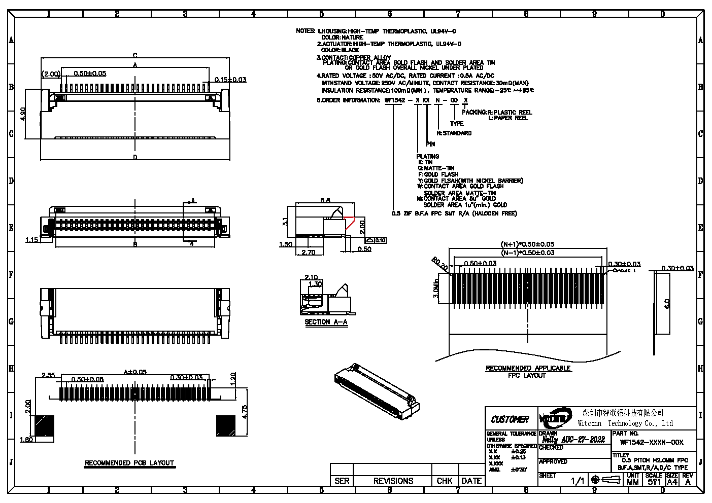 该系列FPC产品料号是WF1542-XXXX-00X,通用型FPC,咬合力大,空压盖子也不易脱落。